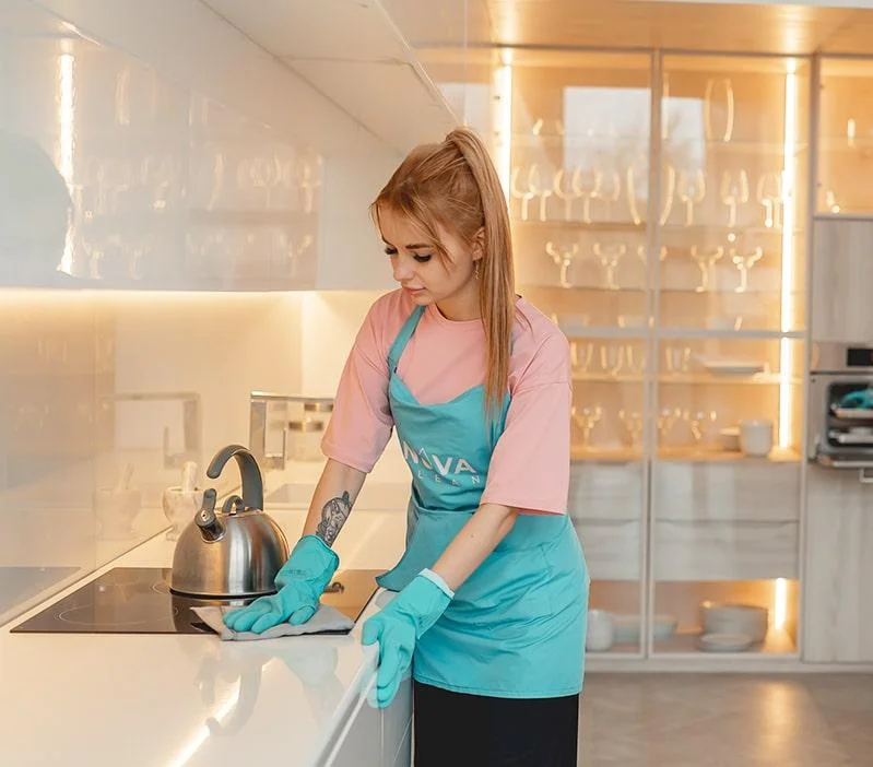 На кухне очищаем плиту, фартук, столешницы, раковину, наружные фасады шкафов, выносим мусор. В санузлах отмываем сантехнику, плитку, зеркала, швы и смесители. В жилых комнатах протираем мебель, подоконники, выключатели, пылесосим ковры.